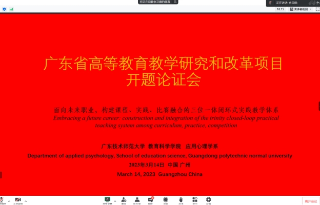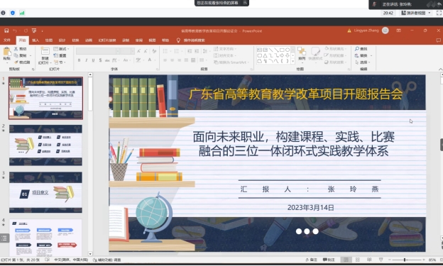 2023年3月14日下午,我院召开广东省高等教育教学改革项目开题论证会。张玲燕老师做了题为“面向未来职业,构建课程、实践、比赛融合的三位一体闭环式实践教学体系”的报告。参加此次会议的有熊华军院长、谢德新副院长、学前教育系黄茂勇主任等领导以及教改课题组老师。
