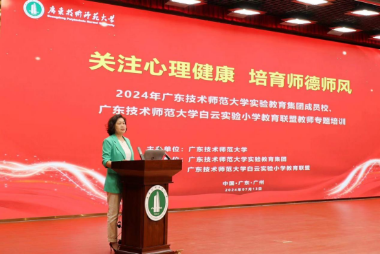 为深入贯彻落实习近平总书记关于学生心理健康工作的重要指示批示精神和全省学生心理健康工作推进会会议精神,为进一步提升教育实验集团成员校教师的心理健康素养,强化师德师风建设,帮助教师掌握情绪管理与压力调节的有效方法,深化对职业道德规范的理解与践行,以更加饱满的热情和专业的态度迎接新学期的工作。7月13日,“关注心理健康,培育师德师风”——广东技术师范大学实验教育集团成员校、广东技术师范大学白云实验小学教育联盟教师专题培训班在我校白云校区图书馆一楼报告厅举办。