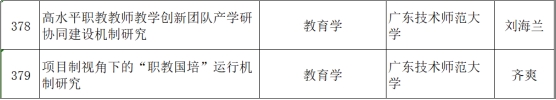 近日,广东省哲学社会科学规划2024年度学科共建项目立项名单发布,我院成功获批2项,分别是刘海兰副院长申报的《高水平职教教师教学创新团队产学研协同建设机制研究》、齐爽老师申报的《项目制视角下的“职教国培”运行机制研究》。