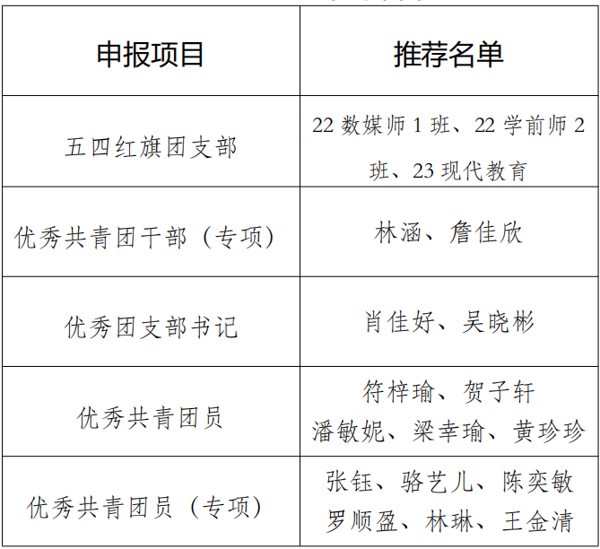 根据校团委《关于开展我校2024-2025年度五四评优表彰工作的通知》要求,经个人自荐和团支部推荐,院团委评定后,拟推荐22学前教育(师范)2班等3个团组织及个人参评我校2024-2025年度五四评优,以上集体和个人均符合参评要求,推选具体名单公示如下(见附件)”。