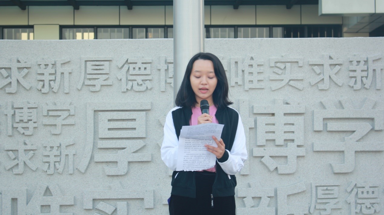 2020级新生代表李怡楠同学以“奋勇拼搏,与国共进”为主题在国旗下发言。她分享了对本次升旗仪式的感想,并表达了对进入广东技术师范大学开启大学学习生活的美好憧憬。她表示,作为新时代的青年,我们要把爱党爱国之志落实成为报国之行,为振兴祖国而勤奋学习,为祖国辉煌的未来贡献出属于自己的力量。
