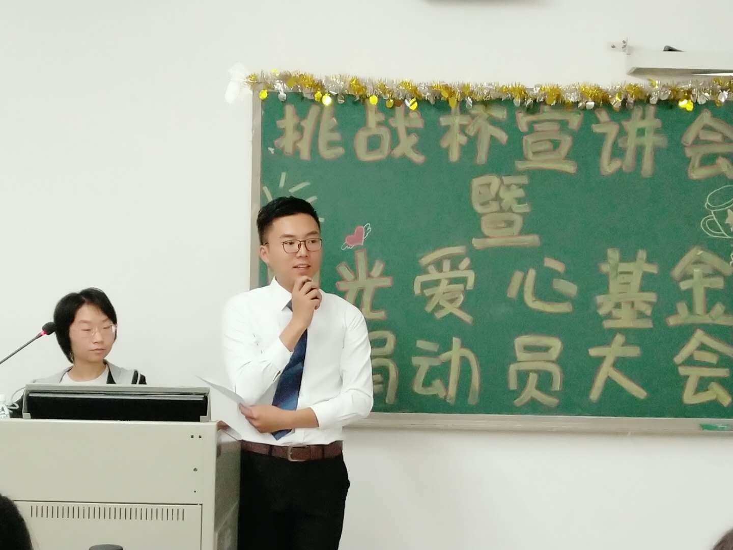 2018年4月18日晚,教育科学与技术学院在二教301课室如期举办了“挑战杯”宣讲会暨阳光爱心基金募捐大会。出席本次活动的嘉宾有党委书记林启词老师、党委副书记吴水爱老师、 团总支书记王孜老师、我院往届参加过“挑战杯”的优秀学生、各二级学院团副及学院各年级的学生代表。本次大会有两项议程:一是“挑战杯”宣讲会,二是阳光爱心基金募捐大会。主持人由艺术团司仪队蒙博睿担任。