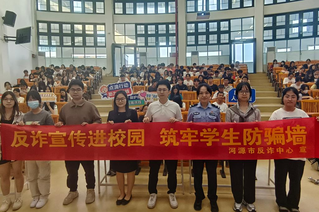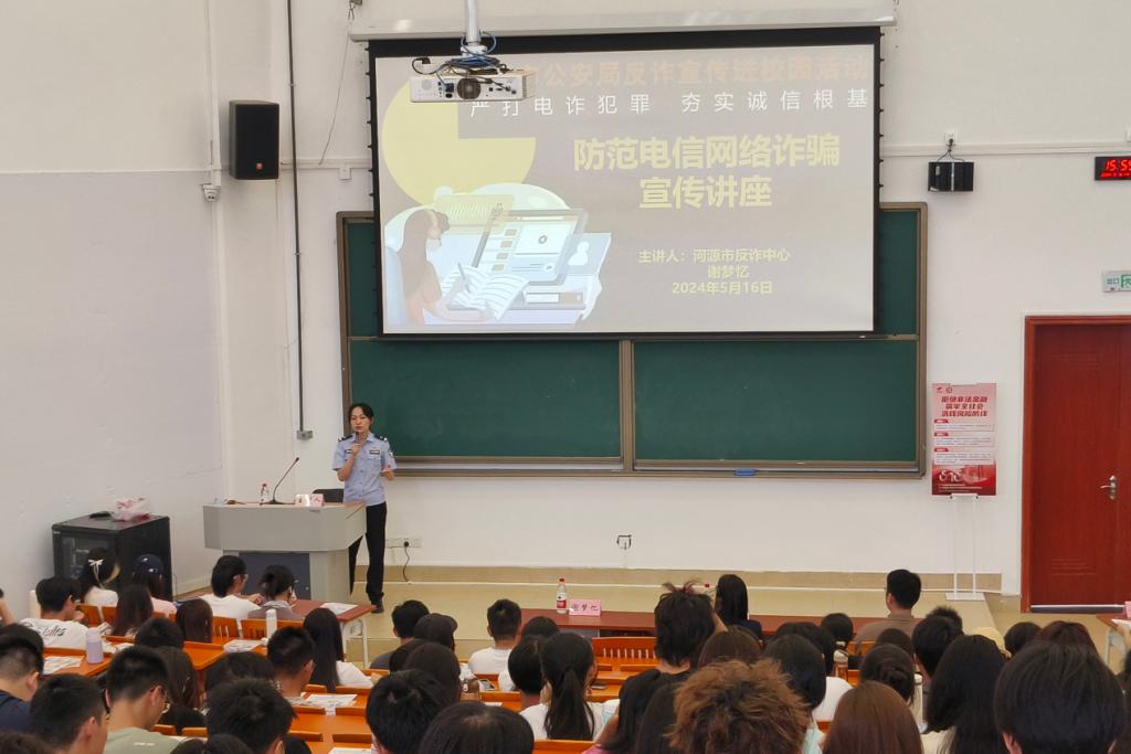 为加强大学生反诈骗反洗钱教育,提高大学生防范电信网络诈骗意识,营造安全和谐的校园环境,金年会于2024年5月16日在河源校区开展了反诈骗反洗钱专题讲座。河源市公安局反诈中心教导员谢梦忆、国信证券河源营业部副总经理何嘉雯、反洗钱专员曾瑜及200余名学生代表参加此次讲座,讲座由辅导员黄立主持。
