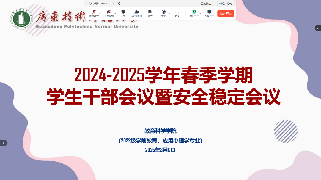 为进一步加强学生安全意识,助力学校管理工作,22级学前教育与应用心理学专业于3月6日召开2024 - 2025学年春季学期学生干部暨安全稳定会议。本次会议由辅导员吴晨阳老师主持,共计150余名班委、宿舍长参会。