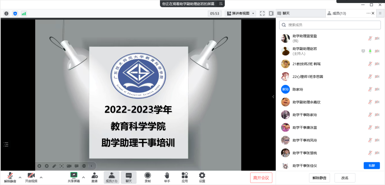 为了深入开展助学服务工作,我院勤工助学服务中心在2023年3月9日晚上九点半召开了一次勤工助学服务中心助学助理干事培训会。本次会议总共分为5个环节,分别是学院领导介绍、学院助理团介绍、助学工作培训、助学日历和助学小组分享交流。这次会议不仅让助学干事们了解我院的领导老师和助学工作内容,还促进了勤工助学服务中心成员们的沟通和交流,便于我院后续助学工作的顺利开展。