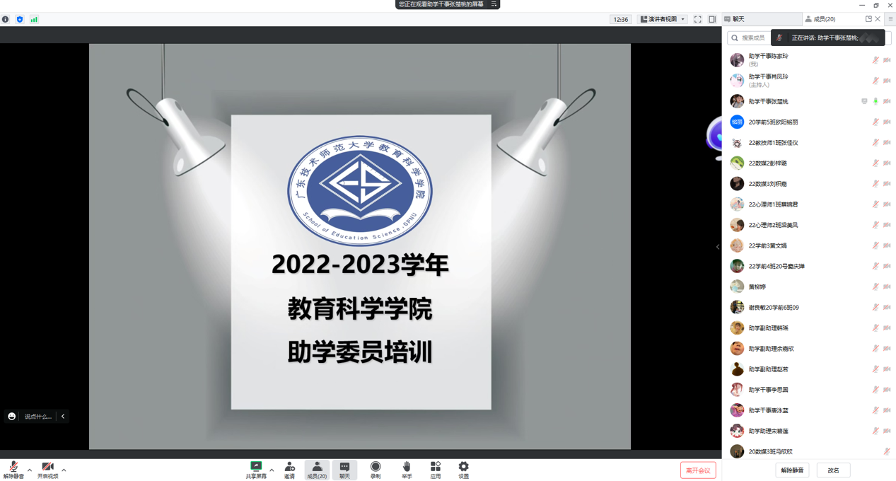 为了进一步优化助学服务工作,我院勤工助学服务中心于2023年3月10日晚上九点半召开了一场2022级新生助学委员培训会。本次会议主要从四个方面展开:明确助学委员具体职责、详细解说家庭经济困难学生认定的申请条件、解释学校资助政策及对应的申请前提、列举助学委员工作所需要注意的事项并对助学委员提出的问题一一解答。这次会议不仅让助学委员更明晰自身职责,还提高了助学工作对接的效率和质量,便于我院后续助学工作的顺利开展。