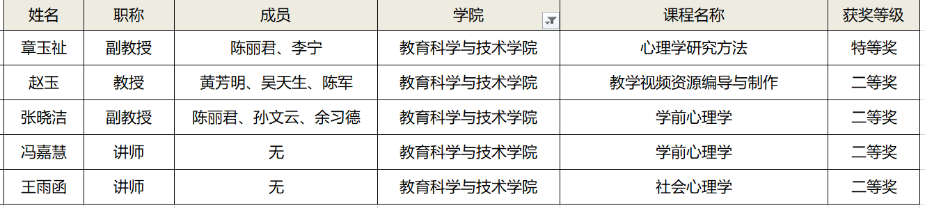 为深入贯彻党的二十大精神,学习贯彻习近平总书记关于教育的重要论述,坚持“立德树人”根本任务,聚焦教学创新,广东师范大学举办第三届教师教学创新大赛并公布获奖名单。其中,我院章玉祉团队的《心理学研究方法》课程在副高组荣获特等奖(排名第一);赵玉团队的《教学视频资源编导与制作》课程荣获正高组二等奖;张晓洁团队的《学前心理学》荣获副高组二等奖;冯嘉慧老师的《学前心理学》课程荣获中级及以下组二等奖;王雨函老师的《社会心理学》课程获得中级及以下组二等奖;教育科学与技术学院也荣获优秀组织单位。