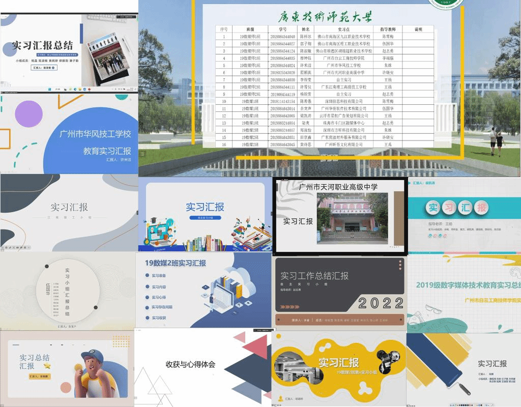 2019级教育实习共有佛山市南海区九江职业技术学校、佛山市南海区理工职业技术学校、佛山市顺德区胡锦超职业技术学校、广州市白云工商技师学院、广州市华风技工学校、广州市天河职业高级中学、广东江南理工高级技工学校7个集中实习小组以及2个自主实习小组;专业实习共有7个实习小组。每个实习小组的实习生代表依次按照顺序向老师和同学们介绍自己小组的工作内容和实习情况,并通过具有自身小组特色的PPT向大家展示了为期16周的实习成果。展示的内容包括实习内容(教育实习为:对实习学校情况的基本介绍、工作内容、听课和授课情况、第二课堂及专业技能工作;专业实习为:各自岗位需要完成的专业性工作)、收获总结与心得体会、实习中存在的问题和反思、以及对师弟师妹的建议和经验分享等。