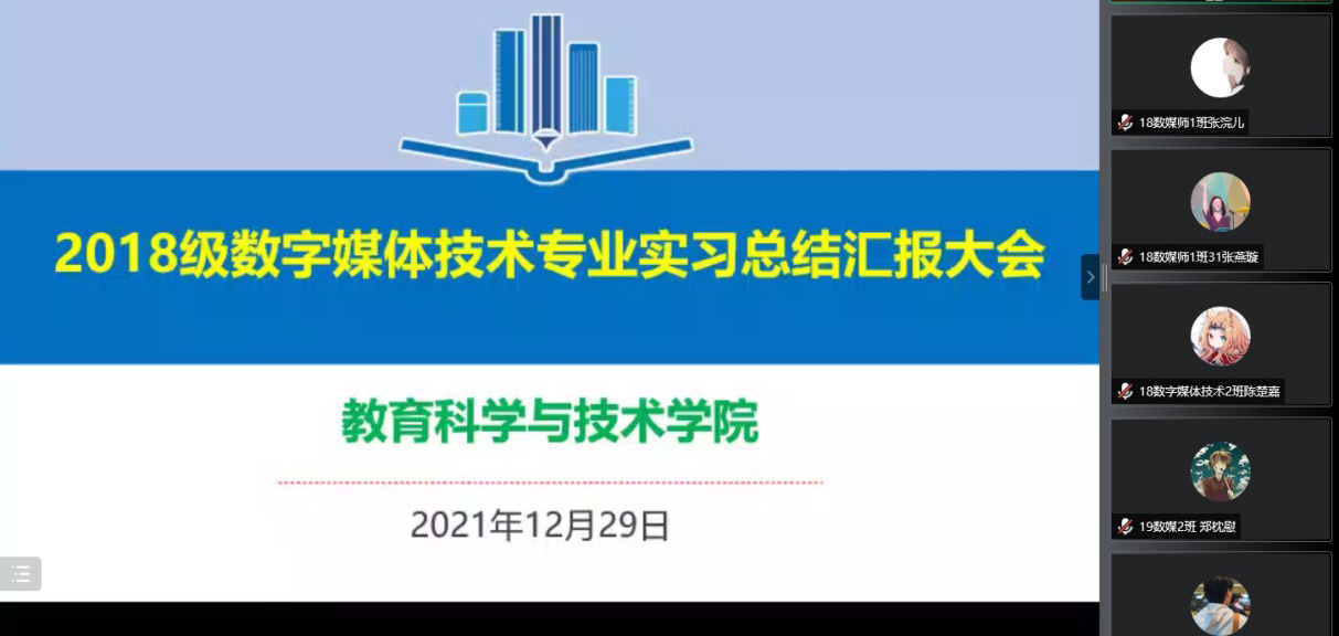 为响应疫情防护工作要求,尽量减少聚集,2021年12月29日下午,教育科学与技术学院2018级数字媒体技术专业实习总结汇报大会顺利在腾讯会议线上召开。我院陶红院长、谢德新副院长、数字媒体技术系主任伍国华老师以及数字媒体技术专业2018级、2019级的学生参加了汇报大会,会议由伍国华老师主持。