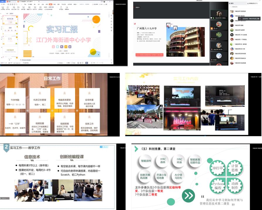 2018级教育实习共有江门棠下初级中学、江门外海街道中心小学、佛山市顺德区龙江外国语学校、顺德莘村中学、南海桃园中学、广州市荔湾区汇龙小学、广州市第一中学、广州市八十六中学、广州市八十九中学、广师大白云实验小学、等12个集中实习点,以及5个自主实习小组。每个实习点的实习生代表依次向与会老师和同学们介绍了自己小组的实习情况,并通过详实生动的PPT、视频向大家展示了为期16周的实习成果。展示的内容包括对实习点情况的基本介绍、工作内容、听课和授课情况、参与活动及项目介绍、实习反思与总结等,同学们在教学实践、专业技术、学生管理等方面收获满满,成功实现了从师范生到教师的角色转变。2018级同学们在回顾实习经历的同时,也积极回答老师和同学的提问,交流热烈,让2019级的同学对即将到来的实习工作有了初步认识。