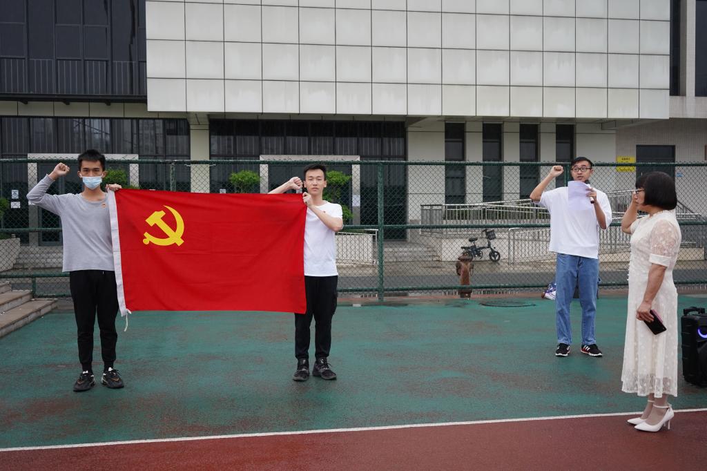 迈着铿锵有力的步伐,国旗护卫队队员精神抖擞,护卫国旗入场。伴随着雄壮的《义勇军进行曲》,鲜艳的五星红旗在全体师生的注目中,冉冉升起。国歌奏毕,学生代表曾世骄同学结合专业和自身实际,围绕“学史明理、学史增信、学史崇德、学史力行”在国旗下作主题发言。仪式上,徐雪梅、李嘉妮、王灿亿、朱建鸿等4名同学带来诗朗诵《红色十月》,用饱满的热情抒发对党和祖国的热爱之情。随后,学生党员在全体师生的见证下,佩戴党员徽章,高举右拳,面向党旗,以庄严宣誓重温入党初心,接受心灵洗礼。