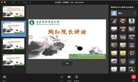 按照学校相关工作部署,为全力做好我院2021届毕业生就业创业工作,增强毕业生的核心竞争力和主动就业意识,9月20日,教育科学与技术学院召开2021届本科毕业生就业创业动员大会。学院党委书记林启词、院长陶红、副书记吴水爱、副院长谢德新、副院长陈丽君、副院长吴天生、党政办主任常锋峰、各系主任赵玉、孙文云、张玲燕、陈雪梅、陈军、方向阳、各毕业班班主任、辅导员、研究生导师等老师和全体本科和研究生毕业生参会。会议由辅导员热依拉老师主持。