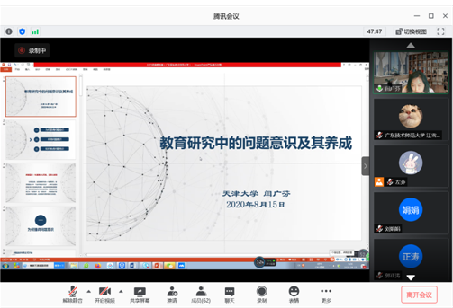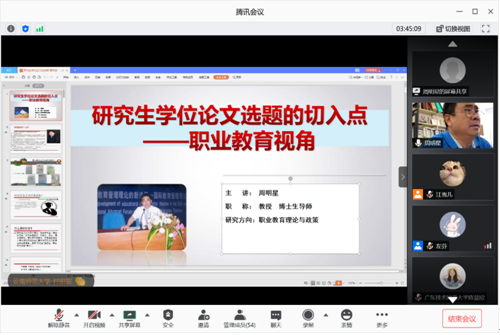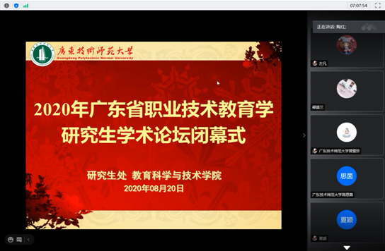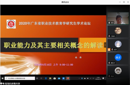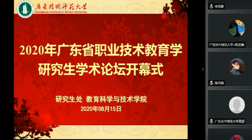 2020年8月15日至20日,由广东技术师范大学研究生工作处、教育科学与技术学院举办的“2020年广东省职业技术教育学研究生学术论坛”通过腾讯会议平台顺利举办。教育科学与技术学院院长陶红教授、研究生处副处长陈泳竹教授以及项目主要成员出席开班典礼,来自云南师范大学、重庆师范大学、广东技术师范大学的研究生学员47名参与会议、旁听会议者数名。陶红教授与陈泳竹教授先后进行开幕致辞。