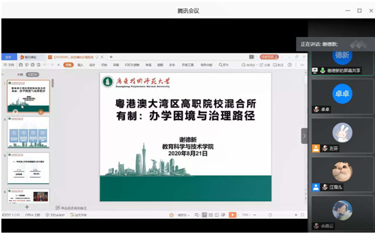 教育科学与技术学院副院长谢德新副教授,围绕“粤港澳大湾区高职院校的混合所有制:办学困境与治理路径”的主题,对湾区的发展背景与基本情况展开较为全面的介绍,并针对粤港澳大湾区高职院校混合所有制存在的“顶层设计缺乏”、“政策协同不够”、“法律体系差异”、“政治制度特殊”等办学困境,提出关于湾区高职混合所有制有效办学治理路径的思考,理据充分,对学生了解湾区研究湾区有较大的参考价值。