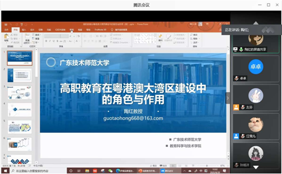 教育科学与技术学院院长陶红教授以“高职教育在粤港澳大湾区建设中的角色与作用”为题,通过对粤港澳大湾区概念、特征与变迁进行梳理,深入解析粤港澳大湾区建设的目标与劣势,继而概括出高职教育在粤港澳大湾区建设中的地位与作用,以及高职教育在粤港澳大湾区建设中“高端技能型人才的供给者”、“产业转型升级的引擎”、“产业融合的催化剂”、“创新驱动发展战略的重要抓手”的角色定位。