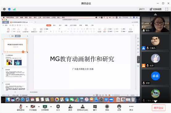教育科学与技术学院朱姝教授以“MG教育动画制作与研究”为报告主题,结合一系列生动的电影动画、MG动画例子,从历史发展进程视角下全面介绍MG动画在各个领域的应用。通过充分展示教育教学领域中MG动画所能带来现场感、动画感、情景感及不可替代性,激发学员探索教育MG动画作为未来教学辅助工具之一的重要内涵,为研究生们树立下MG动画易学、易做、可接触的思维与印象。