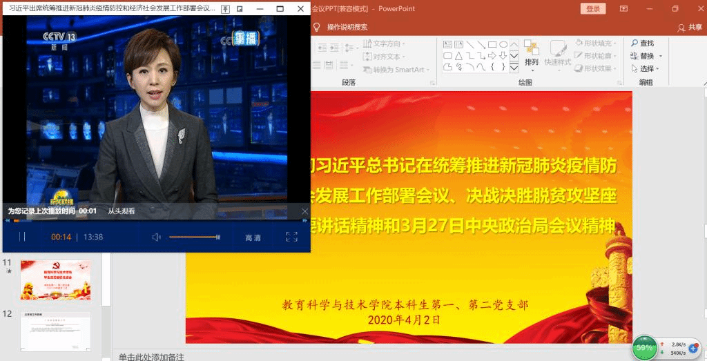 根据学校党委2020年党建工作会议精神和学院党委疫情防控工作部署,4月2日,本科生第一、第二党支部联合举行学习研讨会,深入学习贯彻习近平总书记在统筹推进新冠肺炎疫情防控和经济社会发展工作部署会议、决战决胜脱贫攻坚座谈会上的重要讲话精神和3月27日中央政治局会议精神。受疫情影响,会议通过腾讯会议客户端在线进行,支部书记、辅导员吴晨阳老师主持视频会议并讲话,全体学生党员参加研讨会。