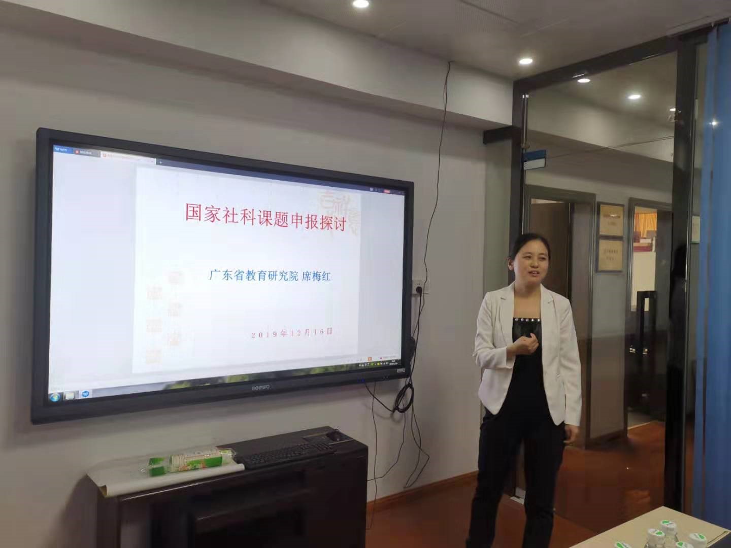 12月16日上午9:00,广东省教育研究院席梅红教授,应邀在东校区(校本部)工业中心718室,为我院作了题为《国家社科课题申报探讨》的辅导报告,我院陶红院长出席,陈丽君副院长主持会议,梁碧珊、张晓洁、邵成智、唐芬芬、黄茂勇、张玲燕等7名教师参会。
