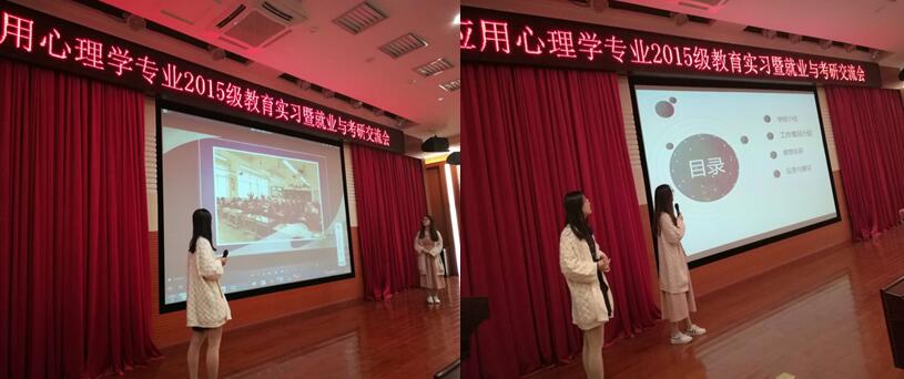 2018年12月25日下午,教育科学与技术学院应用心理学系的师生在3教讲学厅举行了2015级学生实习总结大会。