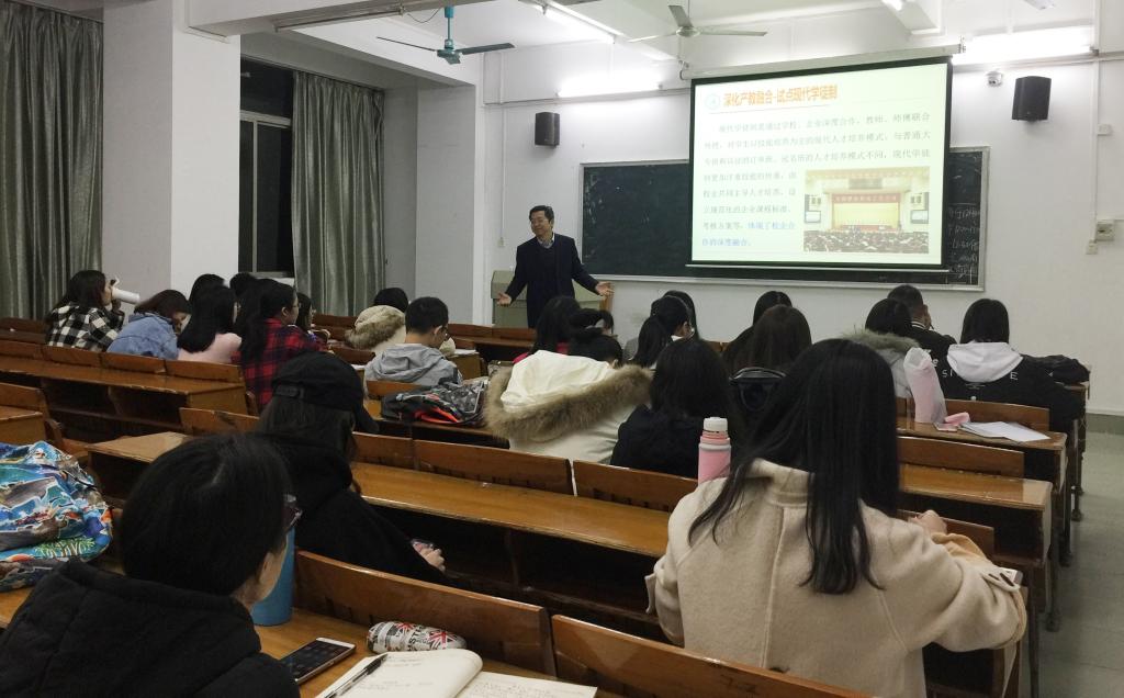 2018年12月13日晚,广州科技贸易职业学院蒋新革教授在第一教学楼201为我院师生作了题为《关于深化产教融合---试点现代学徒制》的学术讲座。教科院全体研究生参加了本次讲座。