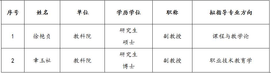 根据《广东技术师范大学学术学位研究生导师遴选办法》以及《教育科学与技术学院学术学位研究生导师遴选工作实施细则》,经个人申请、学院审核和学院学位评定分委员会审议表决,现将我院2019年学术学位硕士研究生拟新增导师名单公示如下: