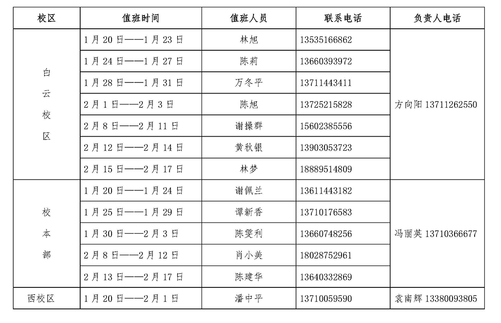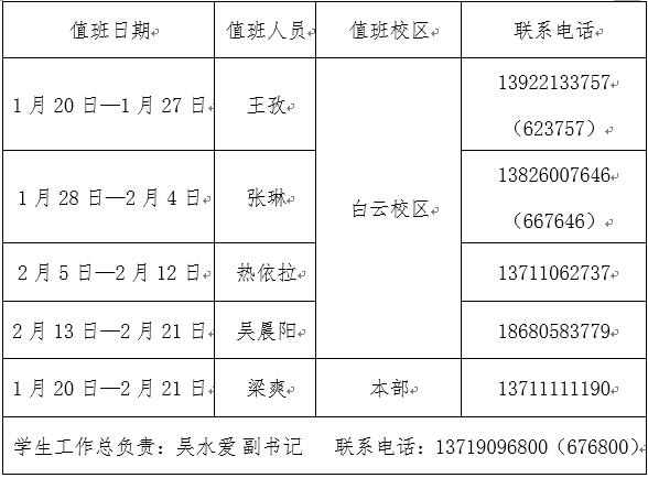 根据学校放假安排,教师放假时间为2019年1月20日至2月21日。寒假期间,实验室将不对外开放,实验设备一律不外借。寒假期间实验中心的值班安排情况如下:
