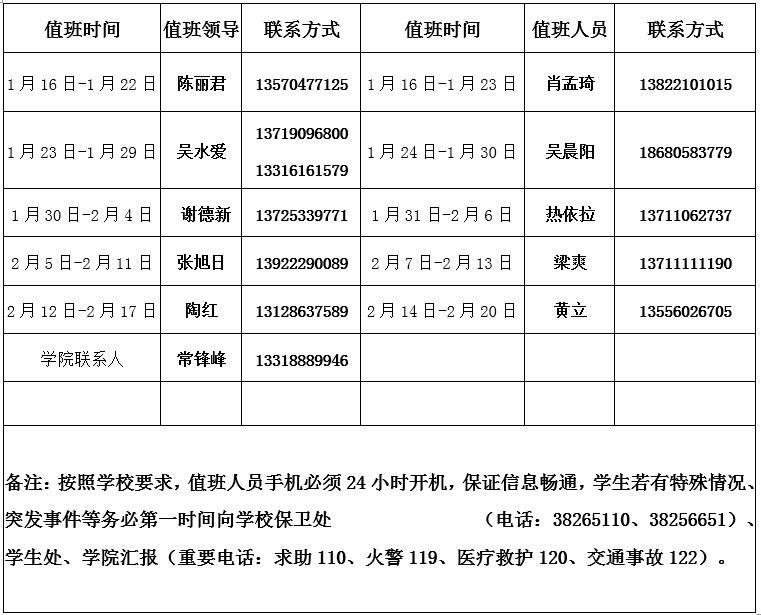 (一)、教师、学生放假时间为1月16日至2月17日,2月18日(星期五)回校报到(注册),2月21日(星期一)开始上课。如学校依据疫情形势发展和相关管理部门要求,调整寒假安排,届时学院会另行通知。