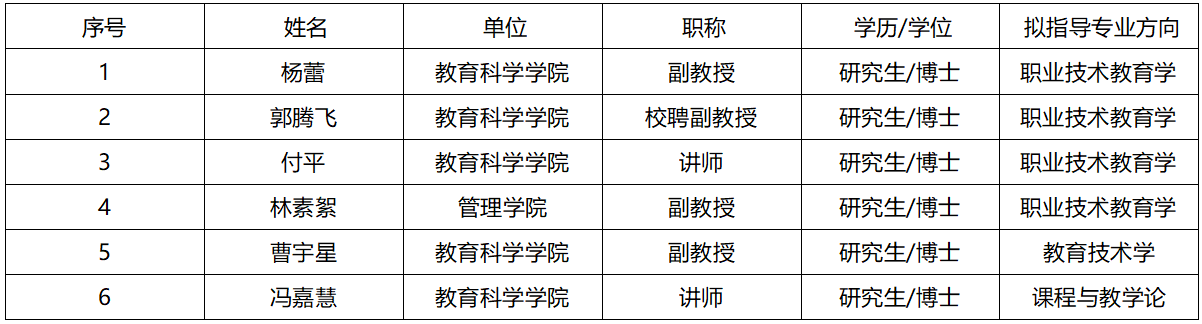 根据学校研究生院发布《广东技术师范大学研究生导师遴选办法》(广师大〔2023〕71号)、《广东技术师范大学专业学位研究生校外实践导师遴选与管理办法(试行)》(广师大〔2020〕215号)等文件精神的相关规定,经个人申请、学院审核和学院学位评定分委员会审议表决,现将我院2023年学术学位硕士研究生拟新增导师名单公示如下(共6人,排名不分先后)