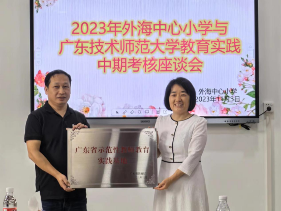 教育技术学系自2021年开始在外海中心小学建立教育实践基地,至今已有三批实习老师到外小进行教育实习,互相促进、共同成长。在外海中心小学余标局校长及信息科组指导老师的鼎力支持下,广东技术师范大学-广东省江门市江海区外海街道中心小学教师教育实践基地入选第三批省级示范性教师教育实践基地,11月3日上午举行了授牌仪式。