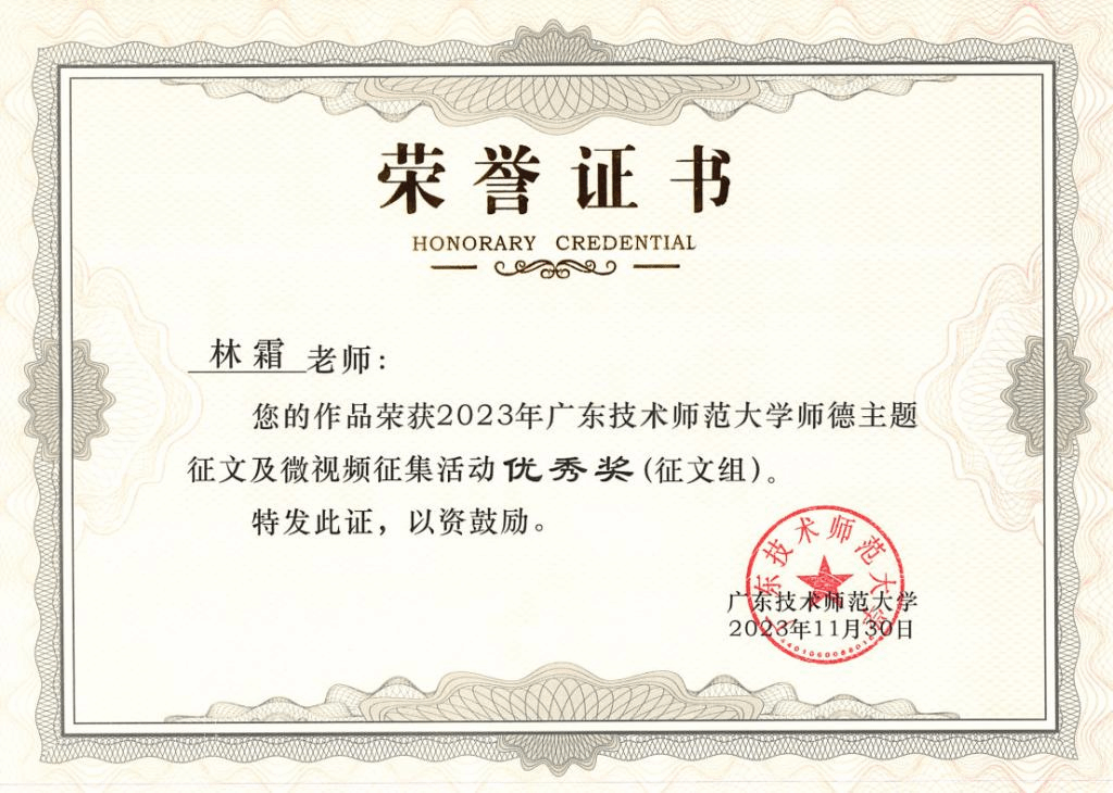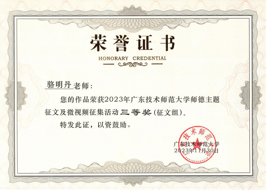近日,学校公布了2023年围绕“躬耕教坛 强国有我”师德主题征文及微视频征集活动评选结果,金年会取得可喜成绩。全校29个二级单位的投稿作品88件(征文71篇、微视频17个),金年会报送的《心之所向,行之所往》(作者:骆明丹老师)荣获征文三等奖,《新时代,新担当》(作者:林霜老师)荣获征文优秀奖。《“双带头人”教师党支部书记工作室建设工作》(作者:陈名祎老师、赵玉教授)荣获微视频优秀奖。