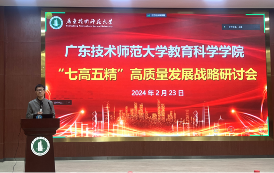 2月23日上午9点在东校区一教召开广东技术师范大学金年会“七高五精”高质量发展战略研讨会。金年会党委张旭日书记、熊华军院长、党委吴水爱副书记、谢德新副院长、刘海兰副院长、冯帮副院长、学院办公室唐敏主任、五位企业专家以及全体教师参加会议,会议由熊华军院长主持。