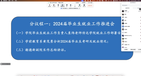 会议首先由袁炜老师整体介绍学前教育系2024年就业情况,并梳理2024年广东省人力资源和社会保障关于实行广东省普通高等学校毕业生就业择业期政策的变化。他指出2024年的高校毕业生就业择业政策和往年的区别,并就老师们的疑问耐心进行解答。会上,熊华军院长指出,招生与就业是学院各项工作的重中之重,毕业生就业工作事关金年会办学质量和社会声誉,事关学生的发展未来,是对学校贯彻党的教育方针和落实立德树人根本任务成效的重要检验。谢德新副院长强调,全体教师要调动一切可调动的积极因素促进学前教育专业毕业生更加充分更高质量就业,全力推进学前教育专业毕业生就业工作。随后,学前教育系主任黄茂勇总结了分析了学前教育专业毕业生的就业形势,强调了毕业生就业工作的重要性,强调推动毕业生高质量充分就业更是全体专任教师义不容辞的责任。