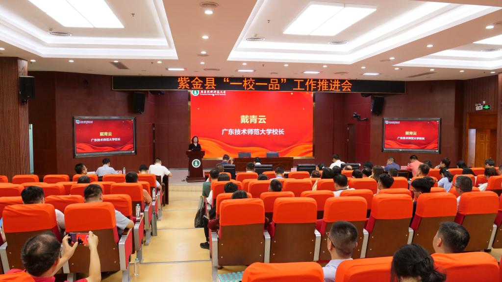 推进会上,广东技术师范大学校长戴青云发表讲话,对远道而来的河源市、紫金县有关领导和教师表示欢迎,戴校长强调了此次推进会的极端重要性,他认为全校上下要统一思想,凝聚力量,积极参与到“一校一品”活动中。并表示学校将不遗余力地提供专业支持和资源配合,确保活动目标的顺利实现,支持紫金县教育局在新时代教育改革的大潮中,秉承特色化办学理念,携手高校专家,共绘“一校一品”教育品牌新蓝图。广东省教育厅“百千万工程”教育行动专班成员张晓梅、紫金县教育局副局长钟坤城及河源市教育局主任督学曾民卫分别表达了开启“一校一品”教育品牌建设对激活学校活力,推动教育质量与特色的双重提升,实现紫金教育的跨越式发展的重要意义,并提出了十分重要的意见和建议。