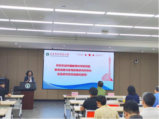 上午九时,戴校长首先对吴霓所长的到来表示热烈的欢迎和衷心的感谢,并简要介绍了学校近年来在教育帮扶方面所取得的显著成果。她指出,教育帮扶是实现教育公平、促进区域协调发展的重要途径,也是广东技术师范大学一直以来的重要使命。希望通过本次报告会,能够进一步加深对教育帮扶国家战略的理解,学习借鉴典型经验,为推动学校帮扶工作再上新台阶提供有力支持。