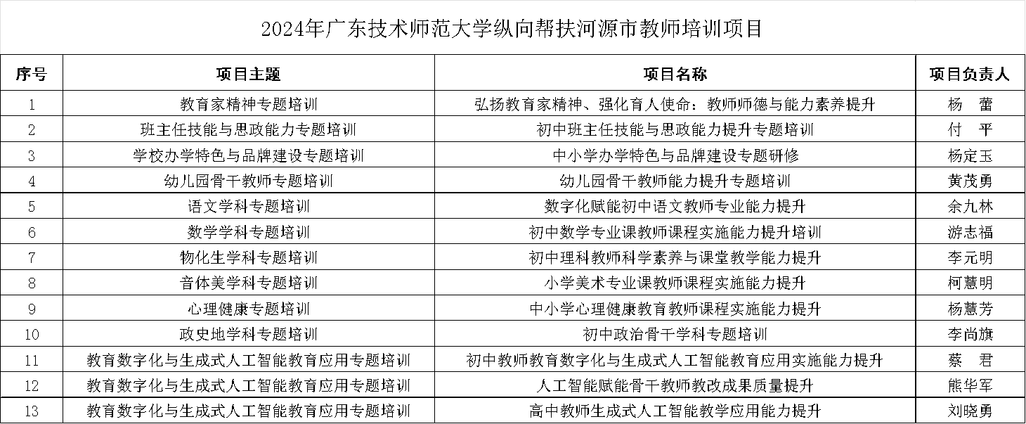 本系列培训旨在通过系统化的课程设计和实践指导,帮助教师掌握先进的教育教学理念和方法,全面提升河源市全学科教师的教学能力。培训开展前进行了充分的需求调查分析,各培训项目团队根据教师需求和单位培训条件,科学申报培训项目和制定项目培训方案。经校内征集、专家评审和校内公示,共资助开展了13个培训项目,包括语文学科、数学学科、美术学科、物化生学科、心理健康和教育数字化与生成式人工智能等多个专题。各项目团队负责人都具有副高以上职称,拥有丰富的学科教学研究和培训经验。