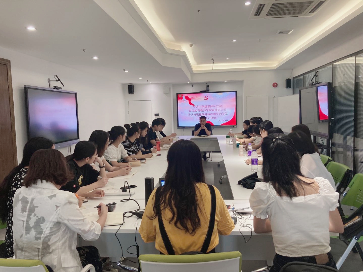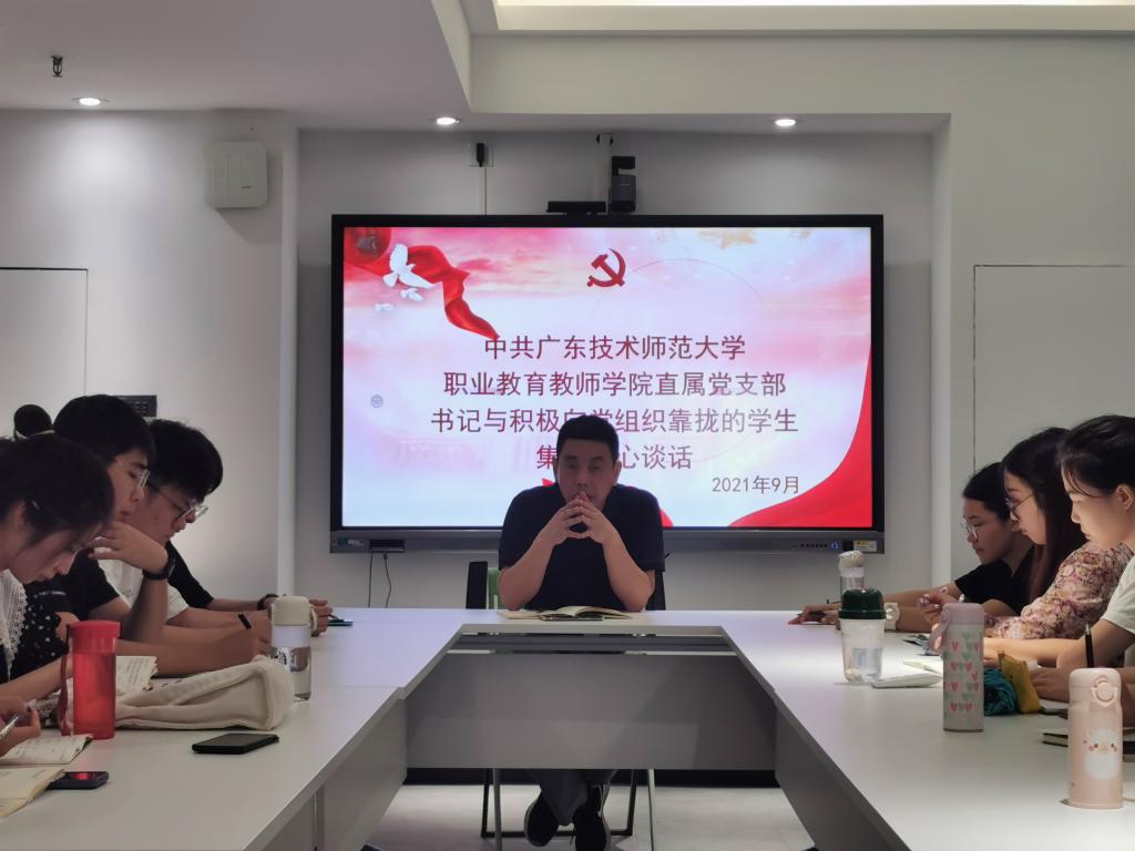 9月27日上午,职业教育教师学院直属党支部书记喻忠恩在东校区工业中心715会议室与20名入党申请人开展集中谈心谈话活动。此次活动,旨在通过谈心谈话,加强对入党申请人的教育引导,了解入党申请人基本情况,激励大家通过学习和实践,坚定入党初心、理想信念,不断磨砺品格提高党性修养。