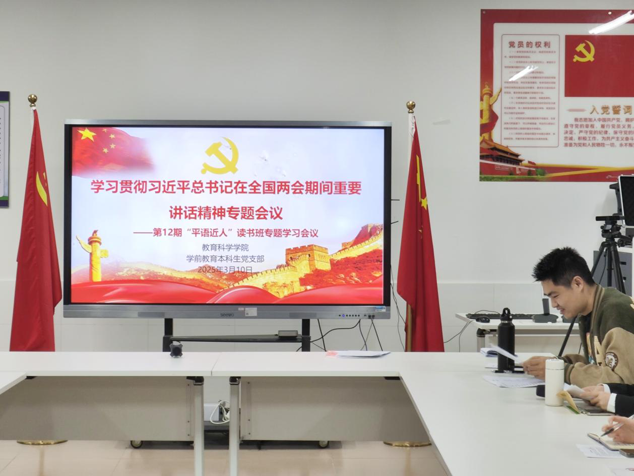 3月10日,学前教育本科生党支部召开全体党员会议,专题学习习近平总书记重要讲话精神暨全国两会精神(第12期“平语近人”读书班专题学习会议)。会议由党支部书记吴晨阳老师主持,全体党员参加。