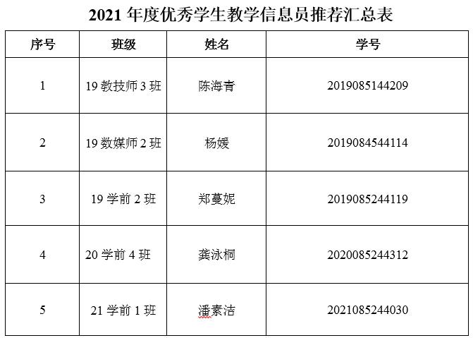 教育科学与技术学院2021年度学校优秀学生教学信息员评选,共有8位学生参评,学院本着公平公正公开的原则,对各位参评学生的申请进行审核并集中讨论,最终拟推荐以下5位学生: