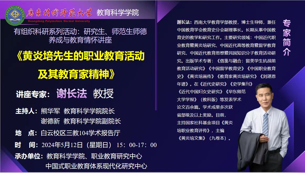 金年会师范生师范养成与教育情怀专题讲座《黄炎培先生的职业教育活动及其教育家精神》