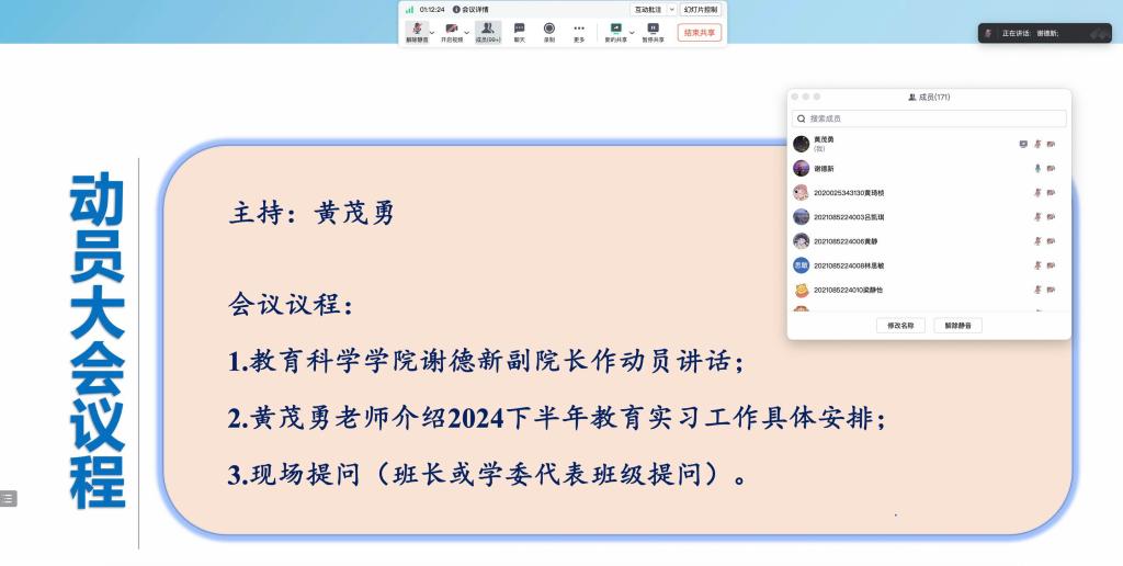 2024年6月28日星期五下午,学前教育系举行了2021级师范生教育实习动员大会。参会人员包括副院长谢德新、专业负责人徐韵莹、教育实习指导老师和2021级全体同学。会议由学前教育系主任黄茂勇主持。