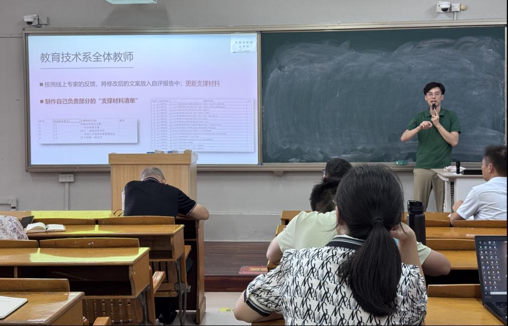 接着,梁乐明讲解教育技术系相关任务的分工情况和具体实施措施,提出要重点关注课程教学大纲撰写内容、学生毕业要求和人才培养的要求是否做好对应,课程评价是否对应课程目标,过程性评价和总结性评价是否统一。对专家进校的评估要求、考试考核材料自查,认证的考查重点等进行了讨论交流。