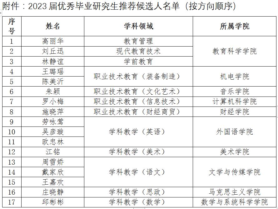 根据《广东技术师范大学研究生奖励评选管理办法》(广师大〔2022〕69号)相关规定,学校分配给教育硕士点的优秀名额是17人(5%)。经过学生自主申报、导师推荐、各培养学院审核、硕士点推荐和集体审议等环节后,拟推荐高丽华等17名同学申报2023届优秀毕业研究生,具体名单见附件。
