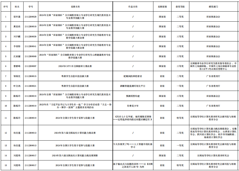 根据广东技术师范大学《关于开展2024年广东技术师范大学研究生优秀科技竞赛成果奖评选工作的通知》(广师大研〔2025〕4号)文件要求及《广东技术师范大学研究生学科竞赛资助和奖励办法》(广师大〔2024〕333号)相关规定。经研究生自主申报,导师推荐,教育科学学院组织评审,现将评审结果予公示三天。