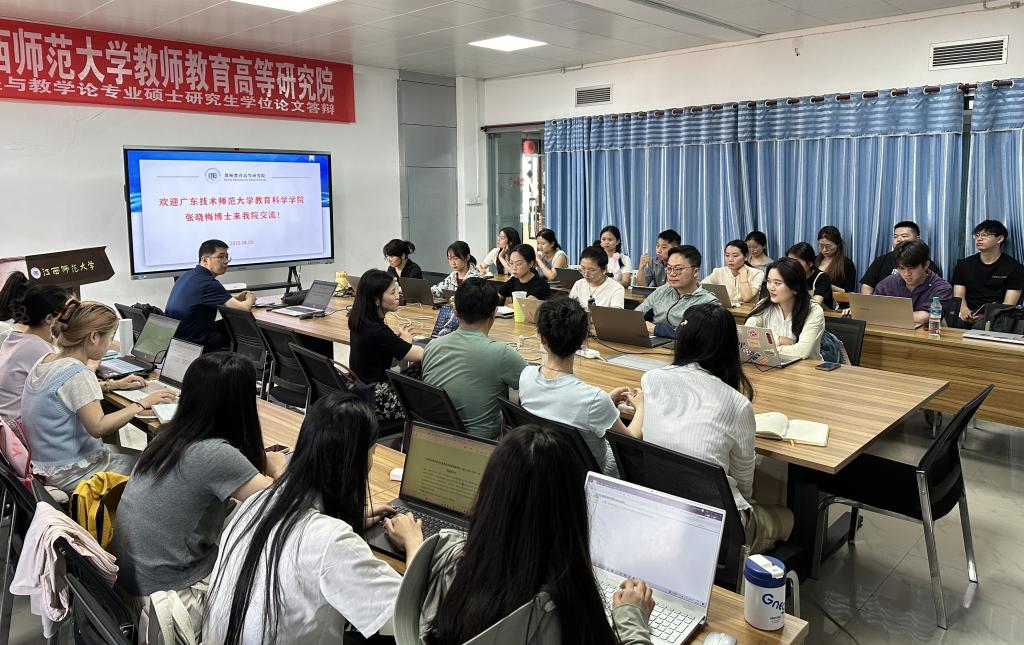 5日上午,张晓梅老师来到江西师范大学瑶湖校区名达楼,与教师教育高等研究院的硕士生和博士生围绕“人工智能赋能乡村教育发展”和“高质量论文写作”两大主题展开学术交流。在座谈会上,张晓梅结合我院在乡村教育数字化转型领域的实践案例,探讨了人工智能技术如何助力乡村教育均衡发展,并分享了跨学科研究的方法与经验。针对研究生普遍关注的论文写作问题,她从选题创新、文献综述、研究方法设计等方面提出具体建议,强调“问题意识”与“学术规范”的重要性。江西师范大学教师教育高等研究院的师生对我院在教育信息化和教师教育研究领域的成果表示高度认可,双方就未来联合开展课题研究、学术互访等合作达成初步意向。